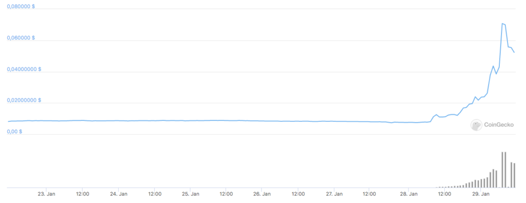 Ажиотаж реддиторов не обошел и активы крипторынка.Сильнее всех выросла монета-мем Dogecoin — на пике ее стоимость прибавляла до 1 000% за сутки. В моменте она даже становилась шестой монетой по капитализации. Сейчас DOGE потеряла треть цены от максимума.