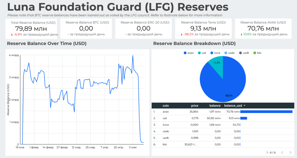 Когда цена UST опустилась до $0.61, из фонда LTG было потрачено $1.5 млрд на то, чтобы поддержать курс UST. Это ненадолго вернуло котировки стейблкоина к $0.9, но вскоре падение продолжилось. Тогда же пошли слухи о выделении инвесторами проекта еще $2 млрд. Сейчас фонд LFG практически опустошен: в нем находится активов лишь на $79.89 млн. При этом в кошельках LFG больше нет биткоинов, средства представлены в LUNA, UST и AVAX.