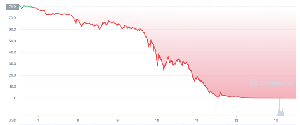 Вслед за UST падала и цена LUNA — когда цена стейблкоина опустилась примерно до $0.3, криптовалюта уже торговалась ниже $30. 9 мая LUNA стоила около $65, 12 мая монета опустила ниже $1.00, а после потери привязки UST начала стремительно падать и сейчас стоит $0.00002698.