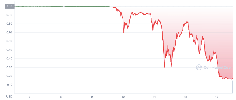 11 мая рынок еще имел надежду на сохранение привязки UST — цена монеты ненадолго выросла до $0.8. Но 12-го и 13-го стало ясно, что дальнейшего краха не избежать.
