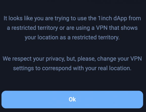 «Мы добавили техническую возможность контроля местоположения и еще одно всплывающее окно с уведомлением об использовании платформы с запрещенной территории», — сказал The Block директор по связям с общественностью 1inch Сергей Масленников.