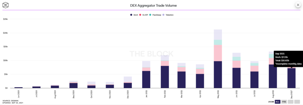 1inch — это доминирующий DEX-агрегатор на рынке. По данным The Block, рыночная доля платформы составляет 66%, а совокупный объем сделок за сентябрь достигает $7 млрд.