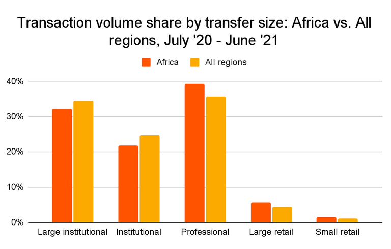 Высокий индекс внедрения во многих странах Африки при достаточно незначительном объеме рынка объясняется повышенной популярностью криптовалют среди крупных и мелких розничных инвесторов, совершающих достаточно весомый объем небольших транзакций. Их доля в общемировом объеме транзакций больше среднего показателя: