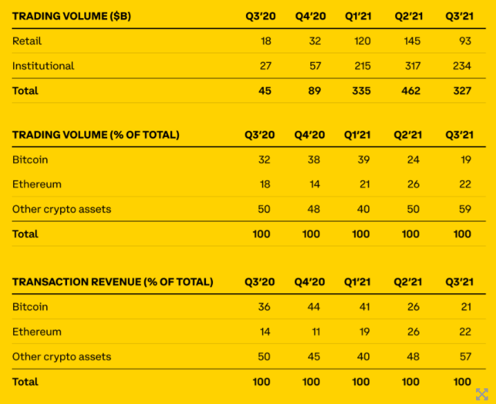 Coinbase предоставила финансовый отчет за третий квартал 2021 года. Выручка компании составила $1.31 млрд, что намного меньше показателя второго квартала — $2.27 млрд.