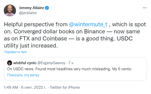 Генеральный директор Circle — компании, которая является оператором USDC — Джереми Аллер положительно оценил шаг Binance.