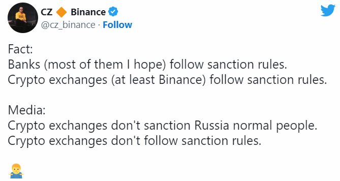 «Факт: банки (надеюсь, большинство из них) следуют санкционным правилам. Криптобиржи (по крайней мере, Binance) соблюдают правила санкций. СМИ: “криптобиржи не накладывают санкции на нормальных людей в России. Криптобиржи не соблюдают правила санкций”».