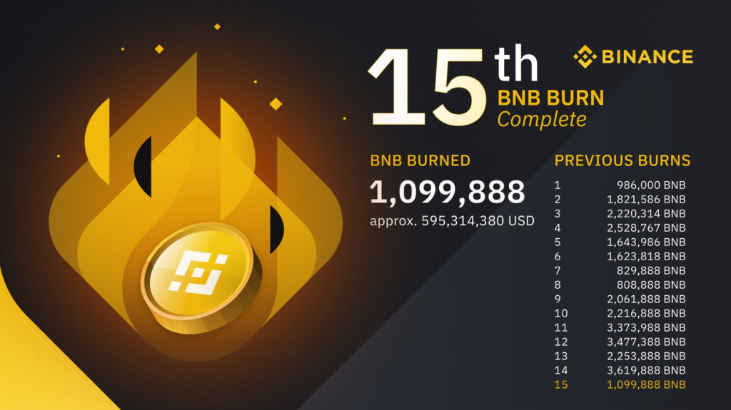 16 апреля 2021 года Binance отчиталась о 15-ом сжигании BNB, которое стало крупнейшим в истории в долларом исчислении. Всего были уничтожены 1 099 888 BNB стоимостью $595 млн по курсу на момент операции. Для сравнения, за четвертый квартал 2020 года Binance сожгла 3 619 888 BNB на $165 млн.