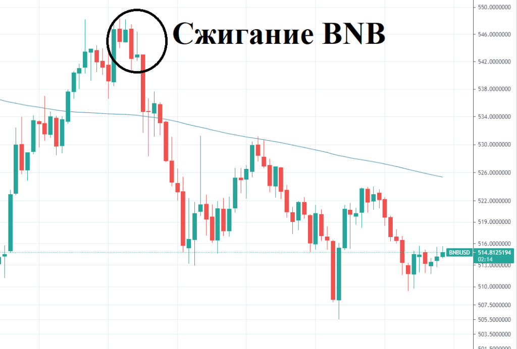 Наблюдается следующая закономерность: за несколько дней до сжигания BNB растет, а после события, наоборот, снижается.
