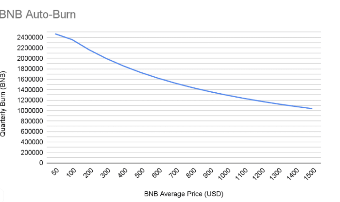 В ближайшее время ежеквартальное сжигание будет заменено на Auto-Burn BNB. Процесс автоматического сжигания будет прозрачным и поддающемся проверке, а также независимым от доходов, полученных Binance за счет использования BNB. Сумма сжигания будет зависеть от цены токена, которая, в свою очередь, отражает спрос и предложение. Также будет учтено количество блоков, произведенных в течение квартала, рассчитанное на основе информации в сети. Формула выглядит следующим образом: