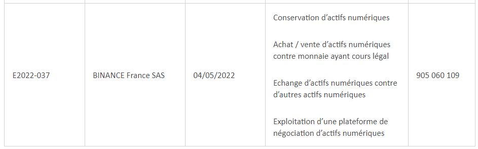 Французский финансовый регулятор Autorité des Marchés Financiers (AMF, аналог Комиссии по ценным бумагам и биржам США) зарегистрировал Binance France в качестве поставщика услуг виртуальных активов (DASP). Французский банковский регулятор ACPR одобрил регистрацию.