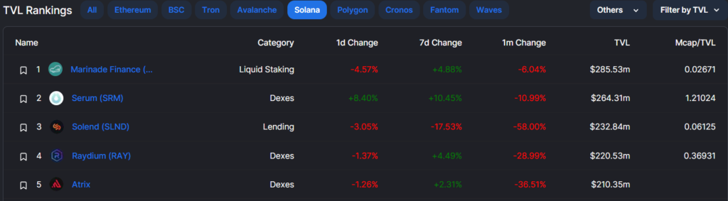 Топ-5 DeFi-протоколов по объему заблокированных средств (TVL) в сети Solana. Источник.