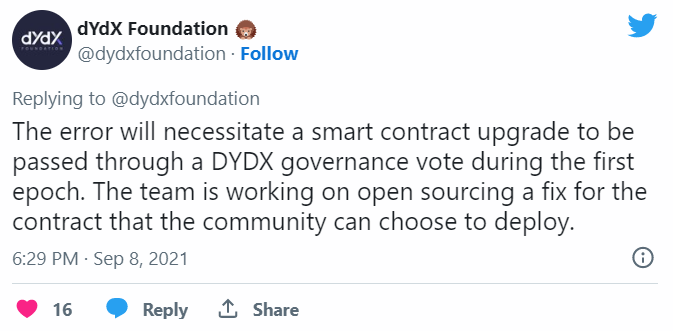 Вместе с выпуском DYDX платформа dYdX представила «пул безопасного стейкинга», который позволяет получать доходность в токенах проекта. Однако в ходе развертывания смарт-контракта произошла ошибка.