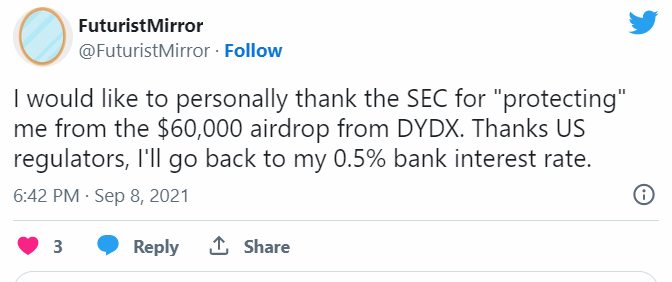«Я хотел бы лично поблагодарить SEC за “защиту” от аирдропа DYDX на сумму $60 000. Спасибо регулирующим органам США, пожалуй, вернусь к своей банковской процентной ставке в 0.5%», — написал пользователь под ником FuturistMirror в своем Twitter.
