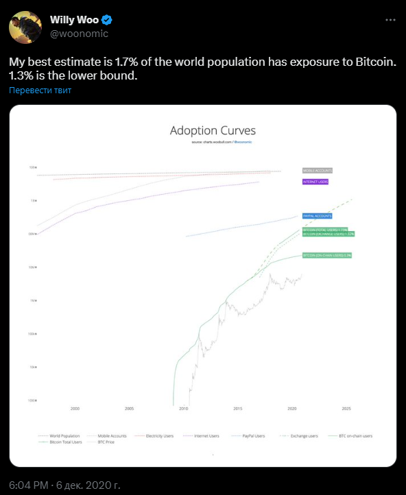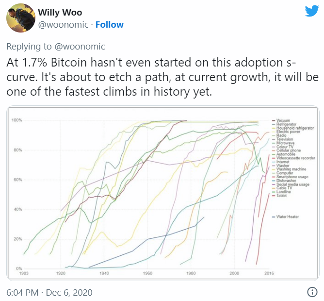 «При 1.7% биткоин еще даже не перешел в зону принятия s-кривой. Он собирается пойти по этому пути, в результате чего это будет один из самых быстрых подъемов в истории». Источник