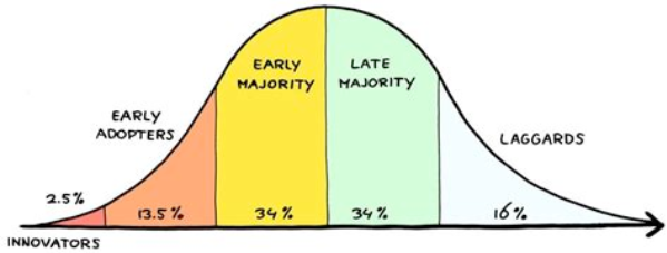 Поскольку сетью на данный момент пользуется менее 2% людей, все они являются ранними инноваторами. О достижении максимального распространения можно говорить в том случае, когда BTC начнут использовать 34% людей.