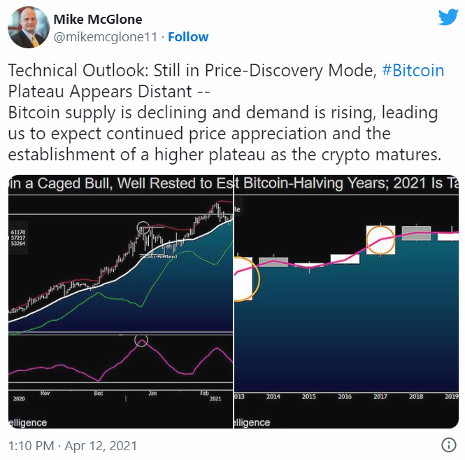 Также аналитик Bloomberg Майк МакГлоун отмечает, что на данный момент спрос на биткоин стабильно растет, а вот предложение, наоборот, снижается.