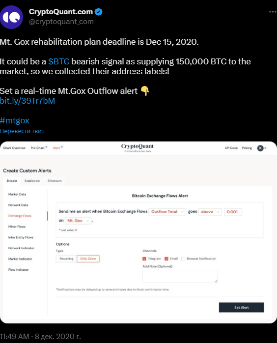 Как отмечает ресурс CryptoQuant, 15 декабря — это последняя дата выплаты BTC. Другими словами, уже совсем скоро на рынок может попасть 150 000 биткоинов, поскольку есть вероятность, что пользователи после получения долгожданной компенсации пойдут на биржи продавать монеты.