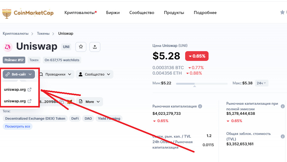 Пример сайта Uniswap на CoinMarketCap. Источник