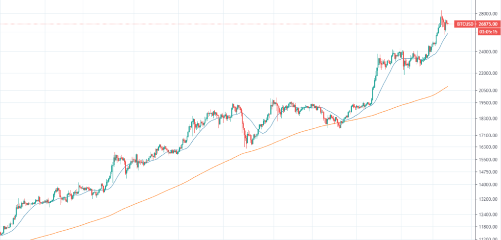 27 декабря цена биткоина выросла до, казалось бы, недостижимых $28 400. После этого последовала коррекция, однако первая криптовалюта по-прежнему торгуется около $27 000. Еще неделю назад эти цифры мало кто мог представить, а сегодня они уже говорят о достижении $30 000. С такими темпами роста преодоление $30 000 для BTC не будет проблемой, однако не стоит забывать о вероятности коррекции, которая вполне может быть.