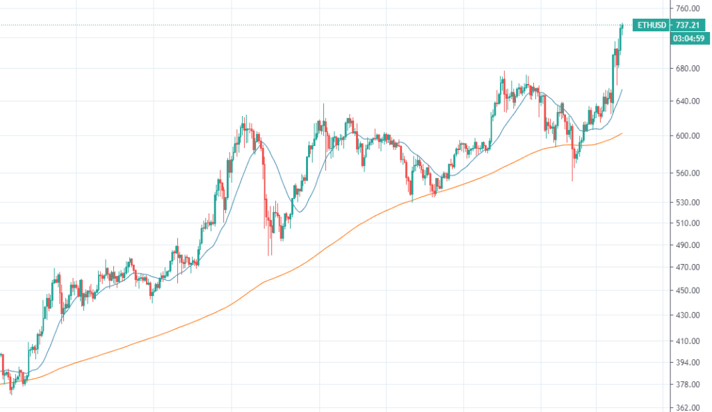 После роста BTC к рекордным отметкам и дальнейшего отката начали демонстрировать силу и альтернативные валюты. Так, эфир поднялся выше $700 впервые с мая 2018 года. На прошлом бычьем рынке в 2017 году наблюдалась такая тенденция: