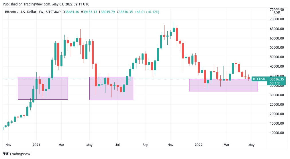 Недельный график BTC/USD, отображающий мощные зоны поддержки. Источник