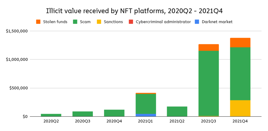 • В третьем квартале 2021 года объем незаконно полученных с помощью NFT средств составил $1 млн, а в четвертом показатель увеличился до $1.4 млн.