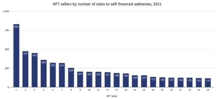 Аналитикам Chainalysis удалось отследить случаи ложной продажи, в результате чего были выявлены сотни таких сделок. Один из фиктивных NFT-трейдеров провел 830 продаж.