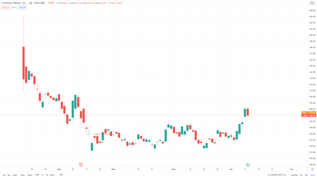 Акции Coinbase 10 августа вечером закрылись на отметке $269, на премаркете они сейчас торгуются по $272.