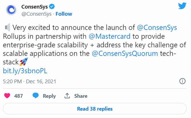 «Очень рады сообщить о запуске ConsenSys Rollups в партнерстве с Mastercard для обеспечения масштабируемости сети». Источник