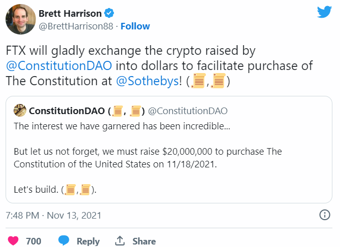 Чтобы выкупить этот уникальный лот, группа энтузиастов запустила ConstitutionDAO с целью собрать $20 млн в ETH. А торговая криптобиржа FTX готова будет обменять собранные криптовалюты на доллары. Об этом сообщил Бретт Харрисон, президент американского подразделения биржи FTX.US, в своем Twitter: