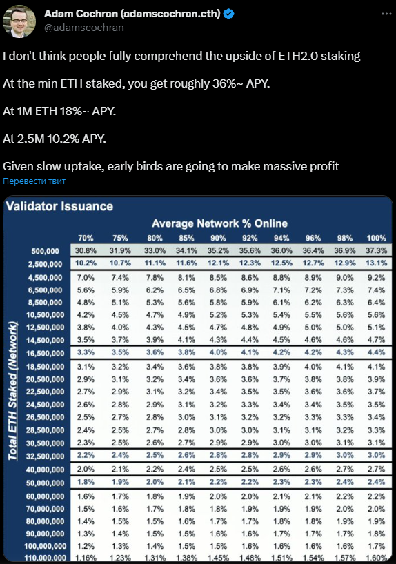 «Я думаю, что люди не до конца осознают преимущества стейкинга. При минимальной ставке валидаторы получают примерно 36% годовых. При 1 млн заблокированных ETH доходность уже 18% годовых, при 2.5 млн — 10.2%. Учитывая медленный рост количества заблокированных ETH, первые валидаторы получат большую прибыль»Источник