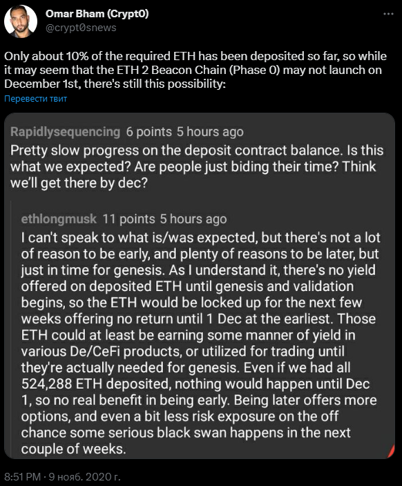 «На данный момент внесли только 10% от необходимого количества ETH, поэтому ETH 2.0 может не запуститься 1 декабря»Источник