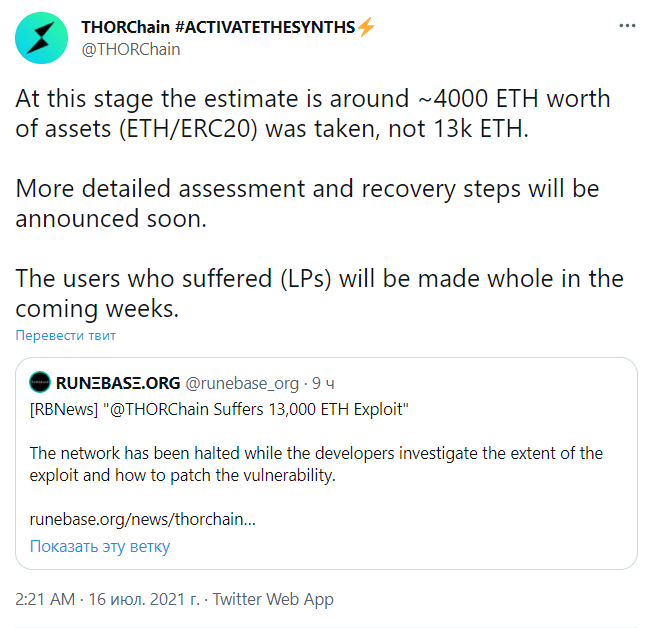 «Хакер украл 4 000 ETH, а не 13 000 ETH. Подробный план по восстановлению активов мы опубликуем позже. Всем пострадавшим пользователям компенсируют их потери», — отметили разработчики THORChain.