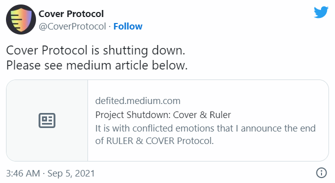 В воскресенье 5 сентября было объявлено о закрытии проекта Cover и связанного с ним сервиса кредитования Ruler. Объявление о прекращении деятельности разместили на странице проекта Cover Protocol в Twitter.