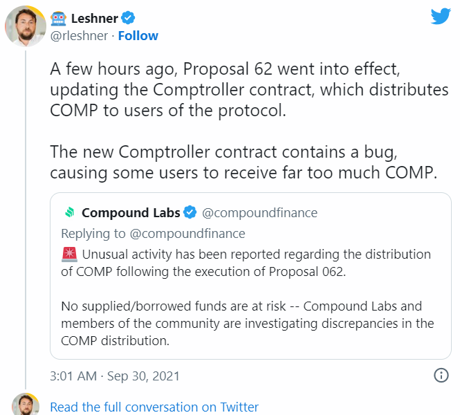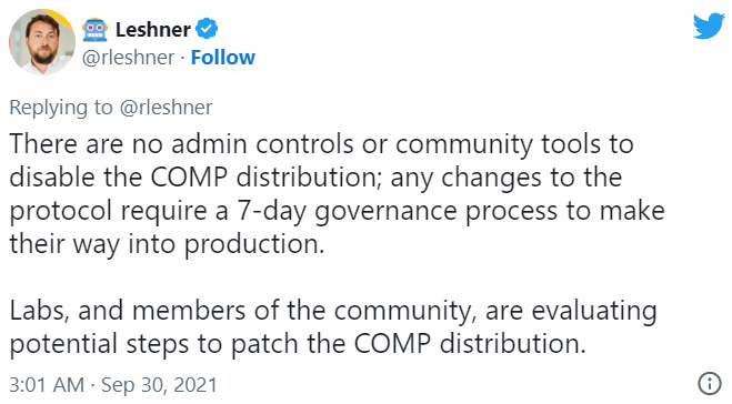 «Не существует никаких элементов управления или инструментов, дающих возможность отключить распределение COMP. Любые изменения в протоколе требуют семидневного процесса согласования до того, как они будут внедрены в сеть. Лаборатория и члены сообщества делают все возможное для исправления ошибок распределения токена COMP». Источник