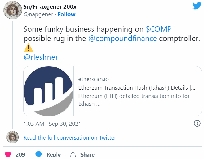 Первым сомнительные транзакции заметил пользователь Twitter napgener, который обнаружил три транзакции размером около $15 млн в токенах COMP, предоставленных в качестве награды за использование займов и предоставление ликвидности в токенах USDC, ETH и DAI, причем суммы подобных операций были достаточно небольшими.