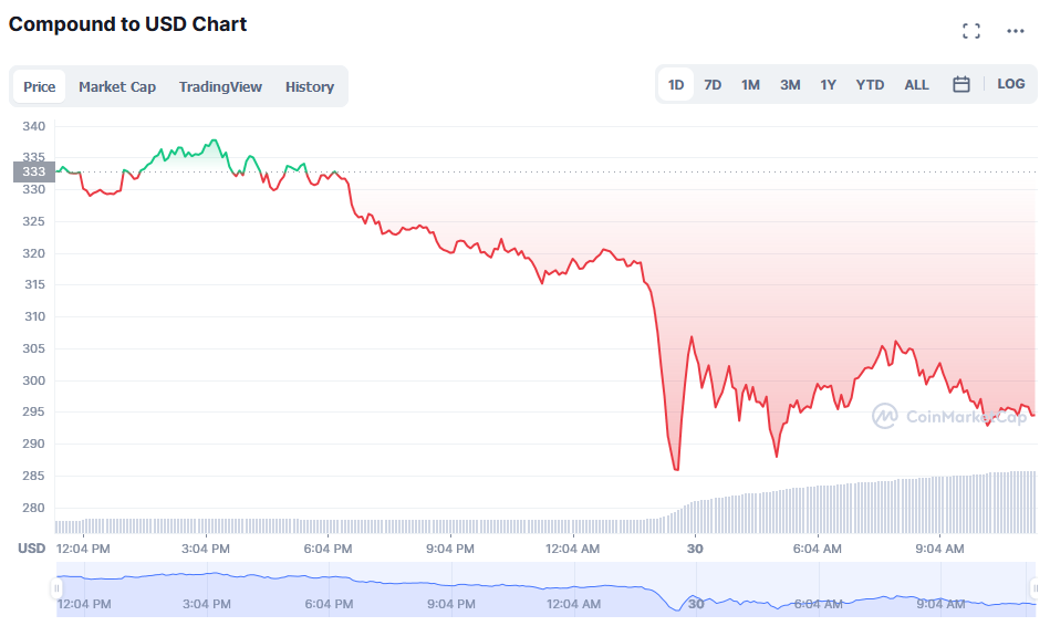 Compound Finance — это один самых крупных протоколов кредитования. По данным дашборда DefiLlama, общая заблокированная стоимость активов в протоколе составляет $9.67 млрд. Нативный токен управления экосистемы Compound COMP на фоне новостей об эксплойте упал в цене более чем на 11% за последние сутки.