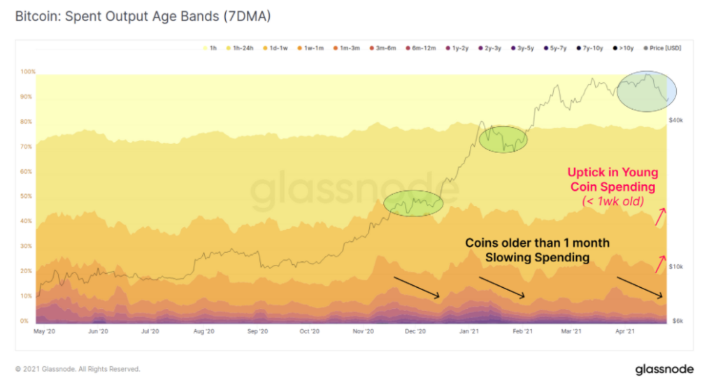 Под старыми биткоинами Glassnode подразумевает монеты, которые лежат на адресе больше 1 месяца неподвижно. То есть владелец адреса пополнил его месяц назад или более и с тех пор не трогал. А молодые биткоины — это те монеты, которые лежат на адресе меньше недели.
