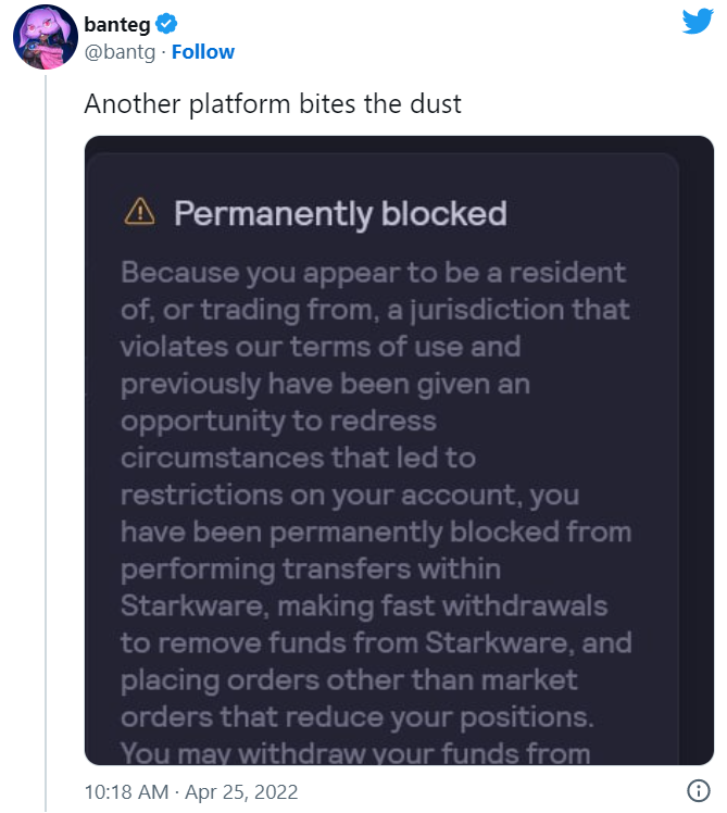 В сообщении говорится, что пользователь торговал из региона, из которого запрещено использовать платформу.