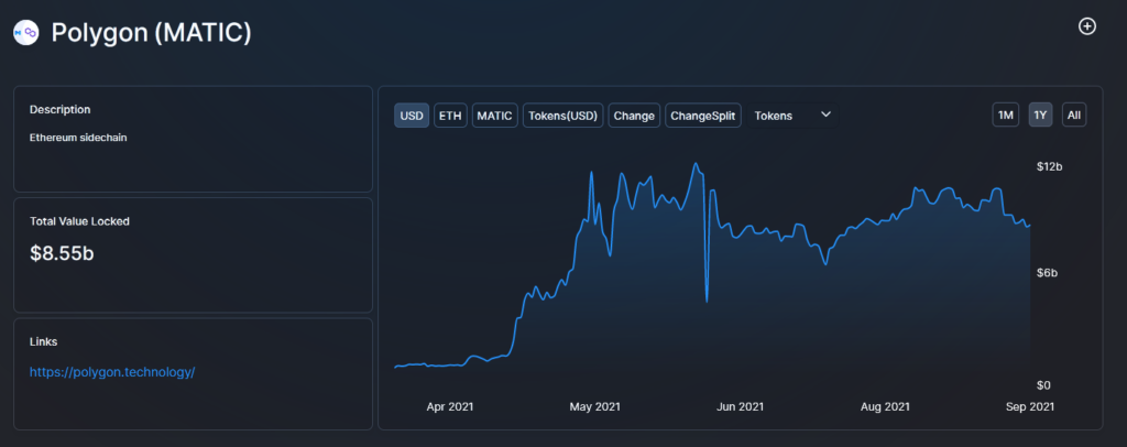 По данным ресурса DefiLlama, общая стоимость заблокированных средств (TVL) протокола Polygon выросла с около $1 млрд в апреле до $8.55 млрд на текущий момент.