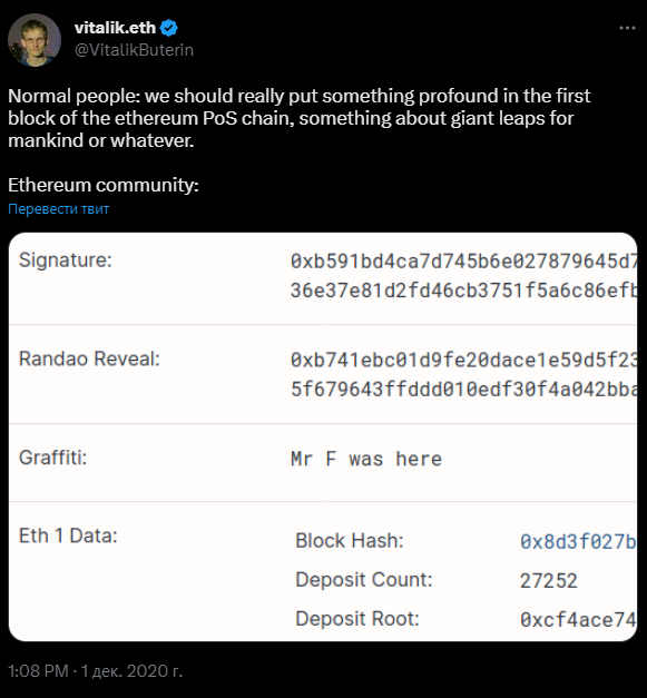 В сети уже появился генезис-блок и первые блоки. Генезис-блок подписали фразой «Мистер F был здесь». Это отсылка к песне Queen — Don't stop me now / Mr. Fahrenheit. Бутерин пошутил, что в первый блок не добавили никакой значимой информации, которая касалась бы всего человечества или чего-то еще.