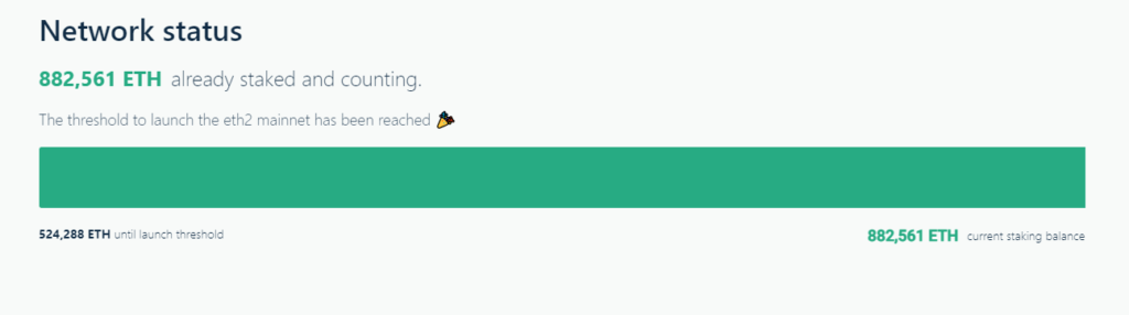 На момент написания статьи в депозитном контракте заблокировано 882 401 ETH, что на 68% выше необходимых 524 288 ETH.