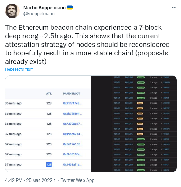 • Ethereum Beacon Chain подверглась реорганизации 7 блоков — это крупнейшее значение за последние годы.