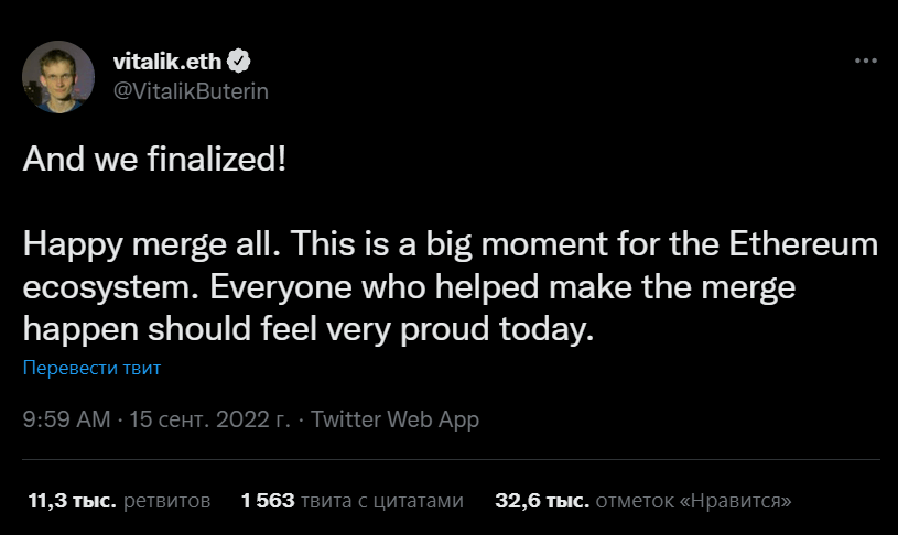 Сооснователь Ethereum Виталик Бутерин поздравил всех с успешным слиянием:
