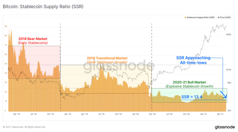 Glassnode в своем новом отчете от 3 мая обращает внимание, что коэффициент SSR (соотношение капитализации биткоина и капитализации стейблкоинов) находится на уровне 13.4. В то же время исторический минимум SSR зафиксирован на отметке 9.6.