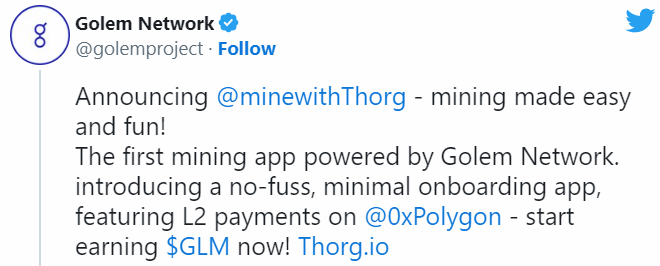 «Представляем вашему вниманию Thorg. Теперь майнинг стал простым и увлекательным! Это первое майнинг-приложение для майнинга на базе Golem Network. Начни зарабатывать GLM прямо сейчас!». Источник