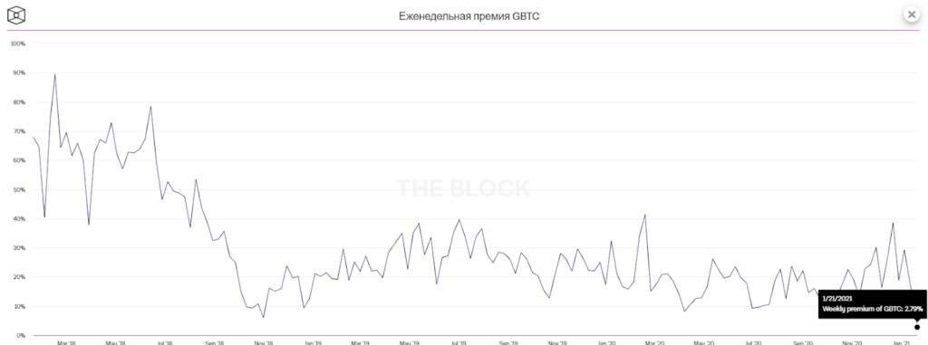Тем временем премия за акции GBTC упала до 3%, хотя еще месяц назад составляла примерно 40%.