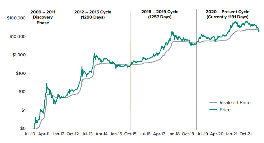 Циклы биткоина: рыночная цена биткоина в сравнении с реализованной. Источник