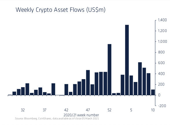 За неделю, которая заканчивается 5 марта, в фонды на базе криптовалют вложили всего $108 млн. Из них 90% инвестировали в продукты на базе биткоина. Для сравнения, в ходе предшествующей недели инвестиции составили $400 млн.