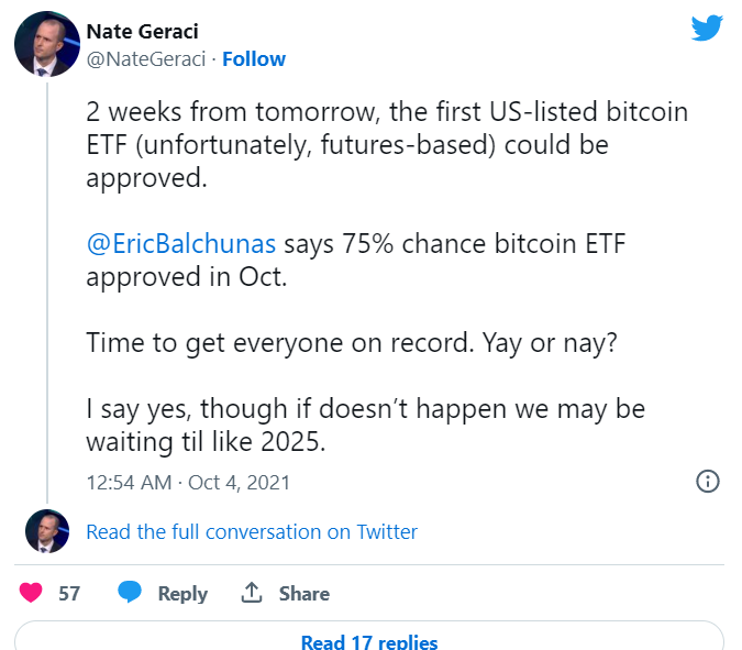 Рост спроса на первую криптовалюту и связанные с ней производные инструменты, скорее всего, связан с положительными ожиданиями относительно решения SEC по одобрению первого биткоин-ETF в США, в основе которого будет лежать не сама криптовалюта, а фьючерсы. По информации президента ETF Store Нейта Джерачи, фьючерсный ETF может быть одобрен Комиссией уже через две недели, об этом он сообщил в своем Twitter.